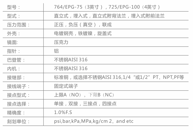 “與4”電接點(diǎn)式壓力計(jì)—我司的725/EPG-100(4英寸)系列電接點(diǎn)壓力計(jì)所使用的電接點(diǎn)開(kāi)關(guān)是來(lái)自德國(guó)與WIKA相同的電接點(diǎn)開(kāi)關(guān) ,廣泛受到世界各國(guó)的用戶(hù)使用。有關(guān)相關(guān)的產(chǎn)品規(guī)格,請(qǐng)參照德國(guó)接點(diǎn)開(kāi)關(guān)說(shuō)明,4英寸圓面與外觀尺寸規(guī)格,764/EPG-75(3英寸)系列,及3英寸圓面與外觀尺寸規(guī)格做說(shuō)明。